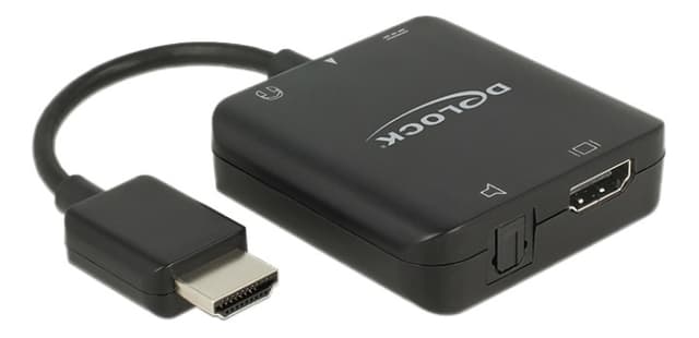 DeLOCK Denne adapteren kan brukes til å trekke ut lydsignalet fra en HDMI-sending. Mens videosignalet vises på en TV eller skjerm, kan lydsignalet overføres digitalt (S/PDIF) eller analogt (stereo) til andre enheter, for eksempel hodetelefoner eller et lydanlegg.