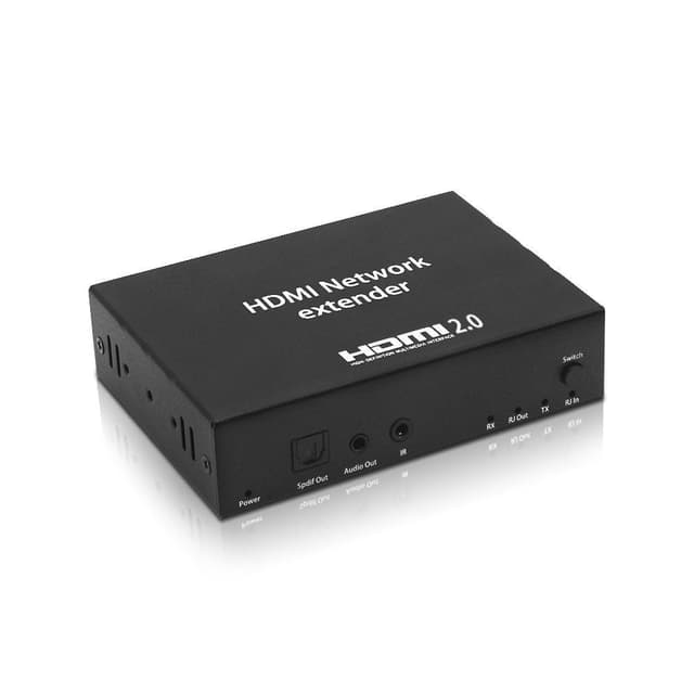 HDMI-forsterkeren kan overføre 4K @ 60HZ signaler på 60 meter ved hjelp av Cat5e eller Cat6 kabler eller 1080P signaler på 90 meter. Signalforsterkeren støtter overføring over lang avstand med både lav stråling og lavt strømforbruk, noe som gjør det til et trygt produkt. Sender og mottaker kan endre funksjon ved å trykke på en knapp på bryterknappen. Forsterkeren støtter også lydkontakter.