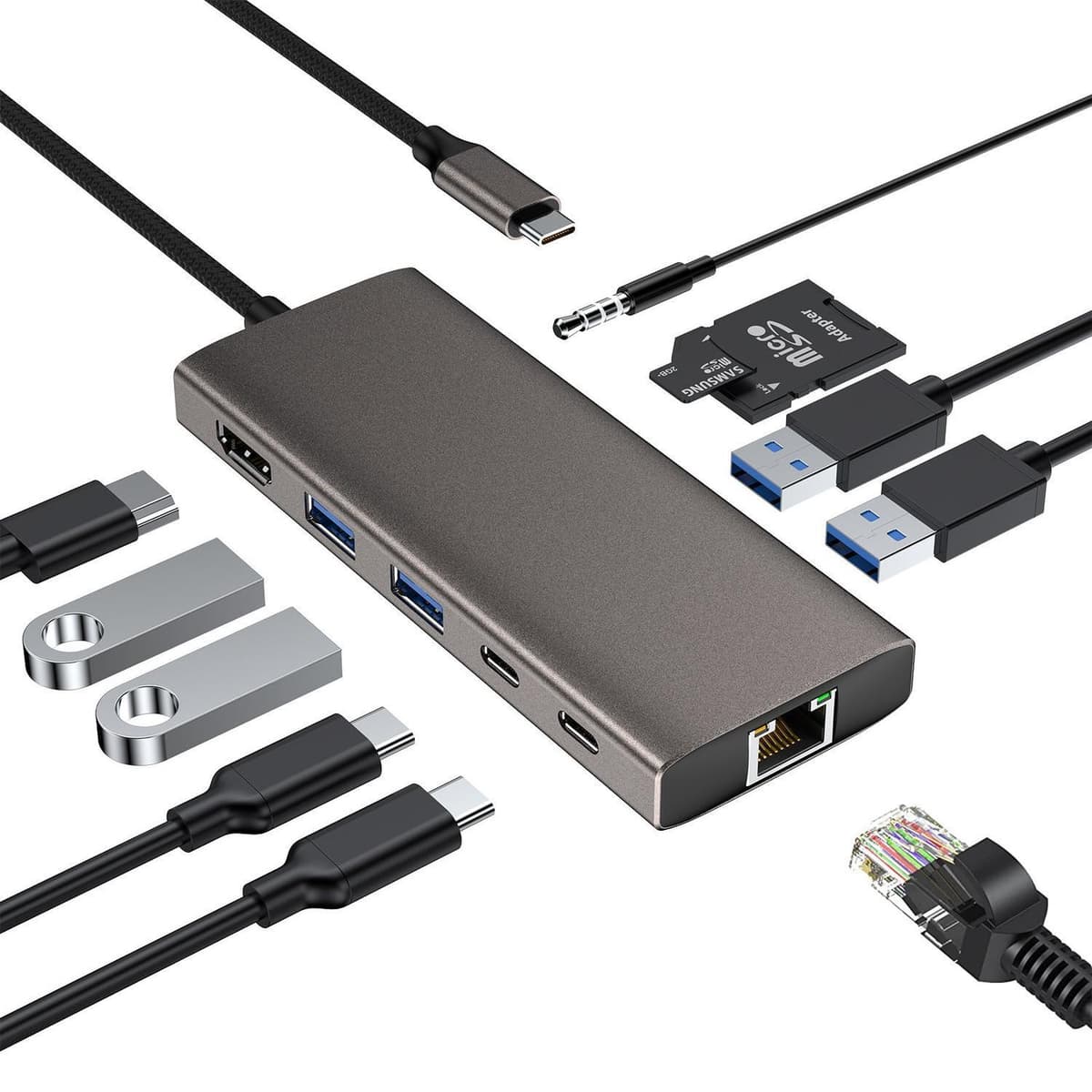 Med denne dokkingstasjonen kan du utvide en USB-C-port i datamaskinen til elleve andre porter, inkludert 1xHDMI, 4xUSB-A, 2xUSB-C, 1xRJ45, 1xAUX og 1xSD-kortleser.Les mer om produktet