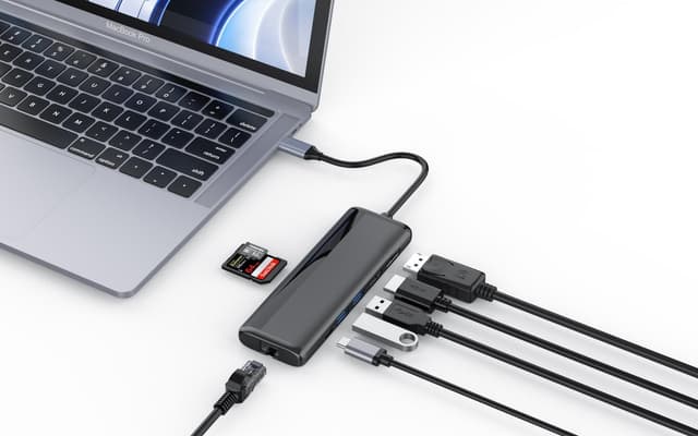 NÖRDIC 1 til 8 dokkingstasjon konverterer en USB-C- eller Thunderbolt-port i datamaskinen din til 8 porter inkludert 1xHDMI 8K 30Hz, 1xDisplayport 8K30Hz, 1xUSB-C Power Delivery 3.0 100W, 2xUSB A 3.1 5GxSD, LAN 1GxSD, LAN 1GxSD 1xMicroSD .