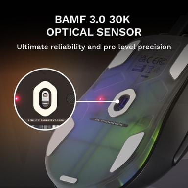 Denne musen drives av den optiske BAMF 3.0-sensoren, som gir presisjon i profesjonell klasse. Den har en enorm følsomhet på 30 000 DPI, en sporingshastighet på 750 IPS og en akselerasjon på 50 G, noe som sikrer at alle raske bevegelser fanges opp med pikselperfekt nøyaktighet.