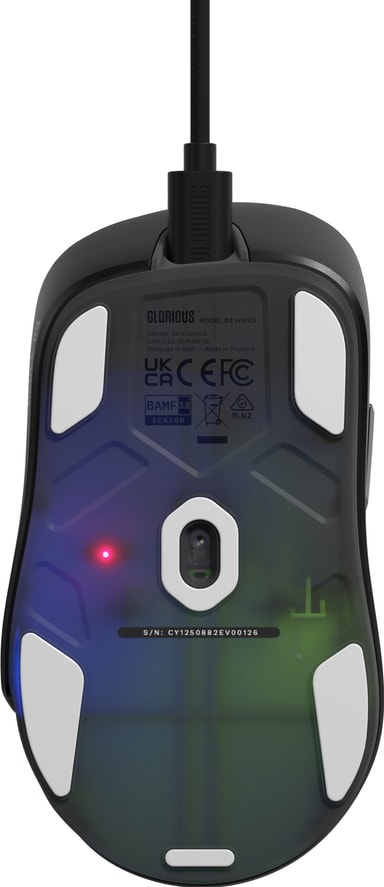 Glorious Model D3 Wired har en høyhastighets USB-tilkobling med en signalfrekvens på 1 000 Hz og en responstid på 1 ms. Den bruker en ultrafleksibel, avtakbar 2 m lang paracord-kabel som er designet for å eliminere luftmotstand, noe som gir en nesten trådløs følelse med kablet pålitelighet.