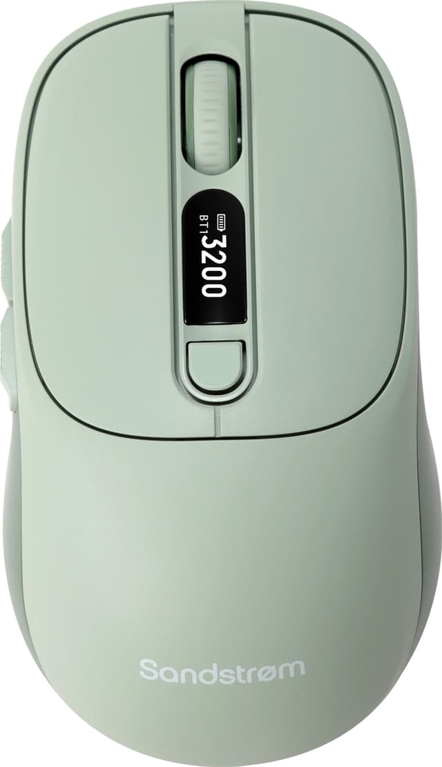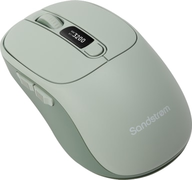 Sandstrøm Dual Mode trådløs mus har Bluetooth & 2,4 GHz dual mode-tilkobling, som gjør det enkelt å bytte mellom to enheter. Den har en optisk sensor med justerbar DPI opp til 3200 for presisjon, 6 knapper med stille klikk, et ergonomisk design og en LED-skjerm som viser ulike statistikker.