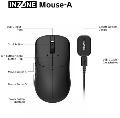 Sony INZONE Mouse-En trådløs gamingmus med en lett konstruksjon på 48,4 g, justerbar DPI opptil 30 000 DPI, 8K signalfrekvens, to tilkoblingsmuligheter og PixArt 3950IZ-sensor for høy presisjon og nøyaktige markørbevegelser.Les mer om produktet