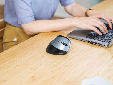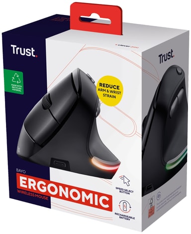 Øk produktiviteten og gi armene dine litt sårt tiltrengt hvile og komfort med Trust Bayo ergo trådløs mus eco. Musen har et ergonomisk vertikalt design og er laget av 79% resirkulerte materialer, og er med det gunstig både for deg og jorden.Les mer om produktet