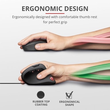 Få økt komfort til lange gamingøkter. Trust GXT 144 Rexx vertikal gamingmus er bygget for deg som sliter med vonde håndledd fra vanlige gamingmus. Takket være den vertikale vinkelen holdes hånden din i en naturlig posisjon som reduserer spenning og lar musklene dine slappe av. Musen har en behagelig tommelstøtte og gummibelegg som sørger for at hånden din ligger trygt på plass.