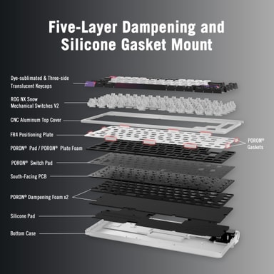 ASUS ROG Azoth X kommer med utskiftbare ROG NX V2 mekaniske brytere som gir en forfinet, mykere typefølelse. De er optimalisert for lyd og kompatibilitet med ulike tasteprofiler, noe som gjør det enkelt å tilpasse oppsettet ditt.