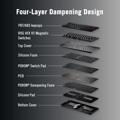 Hot-swappable ROG HFX V2 Magnetic Switches gir ultrapresise tastetrykk med tilpassbar aktivering fra 0,1-3,5 mm og 0,01 mm-trinns innstilling, noe som gir raffinert respons og spillkontroll.