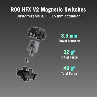 ROG HFX Magnetic-bryterne bruker Hall Effect-teknologi som tillater tilpassbar aktivering fra en hårfin 0,1 mm til 3,5 mm. De har Rapid Trigger for nesten øyeblikkelig tilbakestilling av taster og et forhåndssmurt wall-stem-design som sikrer et jevnt, stabilt og ultraraskt tastetrykk.