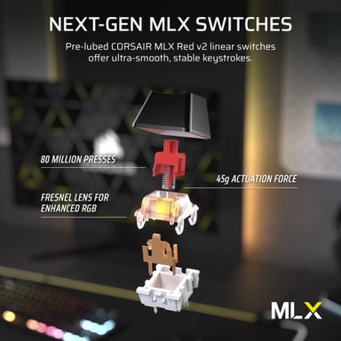 MLX Red v2-bryterne er ferdigsmurt fra fabrikken for en jevn, stillegående lineær følelse rett ut av esken. De har en lett aktiveringskraft på 45g og forbedret design for bedre stabilitet, testet for 80 millioner klikk med konsistent, raslefri gaming- og skriveytelse.