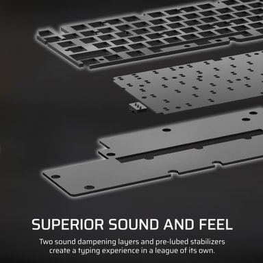 Dette tastaturet kombinerer et plassbesparende Tenkeyless-format med en premium aluminiumsplate på toppen. Det har trelags lyddempning som eliminerer hule ekko og en taktil dreieknapp for raske justeringer. PBT double-shot-tastene sikrer langvarig holdbarhet uten blanke flekker.