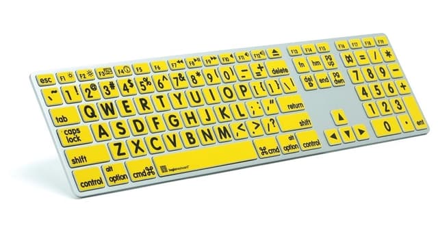 Logickeyboard Large Print Apple svart på gult tastatur er designet for å gi brukerne en enklere og mer nøyaktig måte å skrive på tastaturet ved hjelp av store bokstaver, tall og symboler. Enten du bruker tekstbehandling, regneark eller andre dataprogrammer, vil dette tastaturet hjelpe deg med å lettere utføre oppgavene.