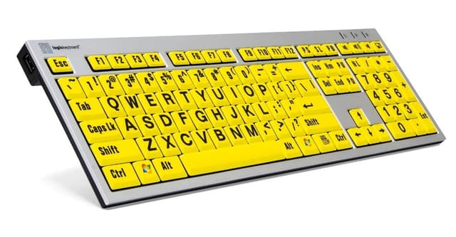 Logickeyboard Large Print PC Slim Line svart på gult tastatur er designet for å gi brukerne en enklere og mer nøyaktig måte å skrive på tastaturet ved hjelp av store bokstaver, tall og symboler. Enten du bruker tekstbehandling, regneark eller andre dataprogrammer, vil dette tastaturet hjelpe deg med å lettere utføre oppgavene.