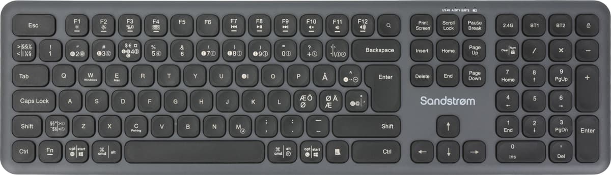 Sandstrøm Dual Mode trådløst tastatur har USB-dongle og Bluetooth-tilkobling, enkel veksling mellom tre enheter, design i full størrelse og stillegående saksetaster for komfortabel skriving på Windows og Mac, en ideell følgesvenn på kontoret.Les mer om produktet