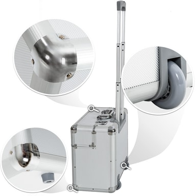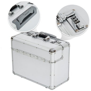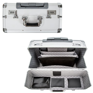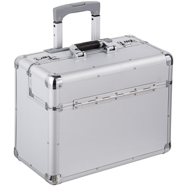 Med denne trillekofferten i aluminiumslook kan du mestre alle forretningsavtaler og gjøre et stort inntrykk. To kombinasjonslåser sikrer at dokumentene dine er godt sikret. Det teleskopiske håndtaket, som kan justeres i 3 posisjoner, og de to jevntgående hjulene gjør det enkelt å bære kofferten. Det er god plass til dine forretningsdokumenter. På grunn av sin praktiske størrelse kan det rullekoffert lett bæres som håndbagasje. Enten for forretnings- eller privatbruk - pilotkofferten i aluminium er alltid den rette reisefølget.