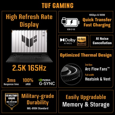 TUF Gaming A16 leveres med 1 TB PCIe Gen 4-lagring, perfekt for deg med et stort spillbibliotek. Med 16 GB høytytende DDR5-minne håndterer den alt fra multitasking til krevende spill uten problemer. Det beste av alt er at både lagring og minne er fullt tilgjengelig og kan oppgraderes, slik at du får fleksibilitet og en løsning som varer lenge.