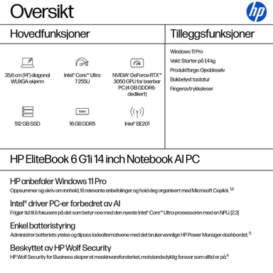 AI-baserte opplevelser og moderne tilkobling forbedrer brukerproduktiviteten. HP EliteBook 6 G1i AI 14-tommers PC tilbyr en 11 TOPS NPU[3], sikkerhet og administrerbarhet i bedriftsklassen i en svært konfigurerbar PC som oppfyller de krevende behovene til bedriftsbrukere.