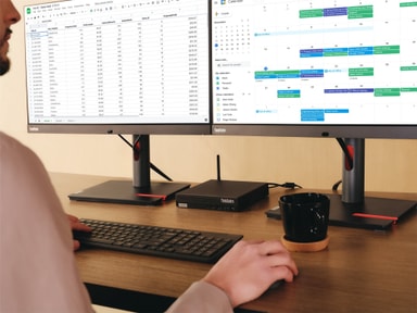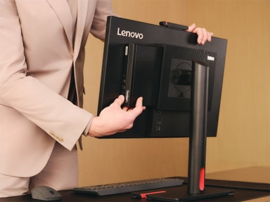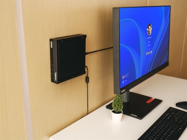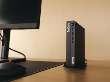 Den kompakte ThinkCentre M75q 5. generasjon tiny PC-en sparer plass og passer nesten overalt. Du kan plassere den vertikalt eller horisontalt. Monter den under et skrivebord, plasser den i en bokhylle, eller lag din egen modulære enhet med vår Tiny-in-One-løsning. Enten det er på kontoret eller bakrommet, så tilfører denne lille PC-en stor stil til ethvert arbeidsområde. Og den støtter opptil tre skjermer.