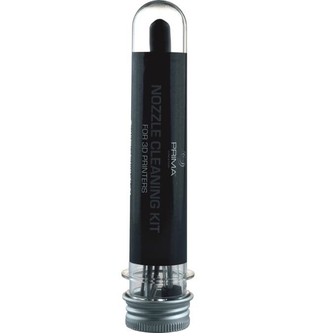 Rensesett for dyser til 3D-printere. Settet inneholder 12 rengjøringsnåler i 5 forskjellige størrelser og lengder, en wire for å rense filamentbanen, og en pinsett.