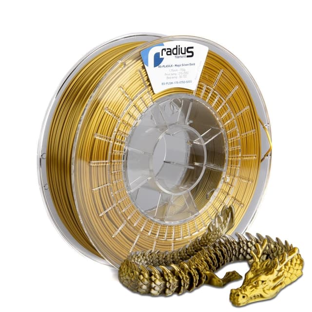 Magic PLA er et nytt filament fra Radius med et unikt utseende. Filamentet er laget av to tråder av filament som resulterer i et trykk som har to farger. Effekten er fantastisk ettersom trykket ser ut til å skifte farge når du snur det og lyset reflekteres på forskjellige måter. PLA er det mest brukte filamentet til 3D-printere og det som er enklest å oppnå gode resultater med. Krever ikke oppvarmet byggeflate. Filamentet leveres vakumpakket. Etter åpning anbefaler vi å oppbevare den i pose med silica gel på et kjølig tørt sted. Hold den unna UV-lys.