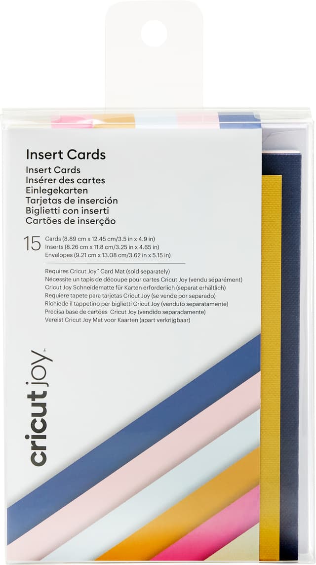 Med Cricut Joy kort A1 15-pk. vil du alltid ha fantastiske, personaliserte kort klare på lager. Kortene kommer i design fritt for lim, noe som gjør det enkelt å lage kort med to ulike fargetoner. Denne pakken inkluderer 15 A1-kort i forskjellige farger – Twilight, Tulip, Powder Blue (8,89 cm x 12,45 cm), 15 kortinnlegg - Mustard, Party Pink, Khaki (8,26 cm x 11,8 cm), 15 hvite konvolutter (9,21 cm x 13,08 cm). Brukes sammen med Cricut Joy. Krever Cricut Joy Mat (selges separat).