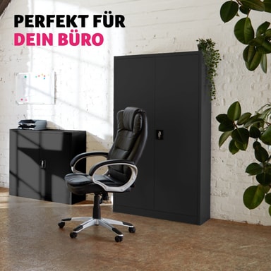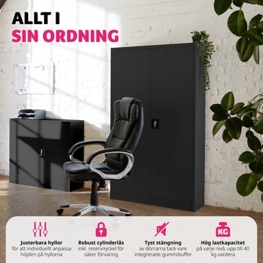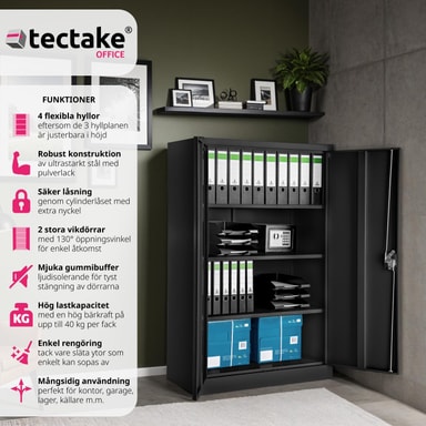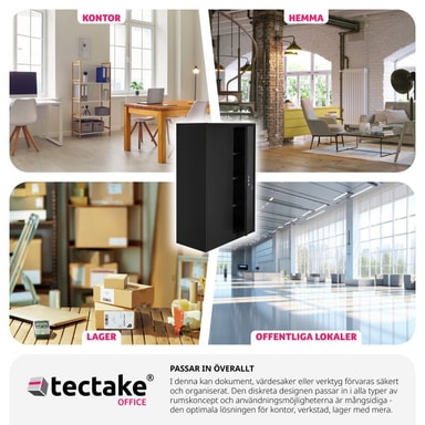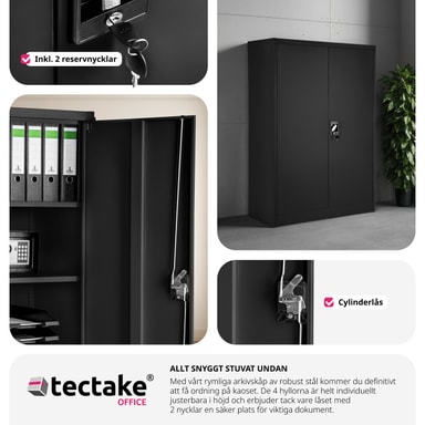 Få orden på din dokumentoppbevaring! Med det låsbare dokumentskapet fra tectake oppbevarer du dokumenter og viktige papirer på en sikker og samtidig oversiktlig måte. Våre kvalitetsskap passer utmerket for ulike bruksområder som verksteder, lager og virksomheter samt for kontor, kjeller eller arkiv. Skapet består av en holdbar stålplatekonstruksjon. De tre hyllene kan individuelt justeres i høyden og de passer utmerket for oppbevaring av for eksempel permer. Dørene er forsterket med firkantrørprofil. Stommen og dørene er av stålplate, med en holdbar pulvermalt brannlakkering. Takket være sin nøytrale fargefremtoning passer dokumentskapet inn i de fleste rom.
