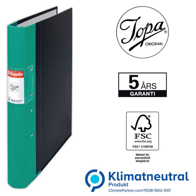 Esselte Jopa er en svensk originaloppfinnelse som ble produsert så tidlig som i 1889. Det er verdens første klimanøytrale treryggperm, og de lave karbondioksidutslippene fortsetter å reduseres gjennom pågående magre tiltak. I tillegg er dekselet FSC®-sertifisert og produsert i EU. Med 5 års garanti er det ingenting som slår det svenske originalomslaget, Jopa.