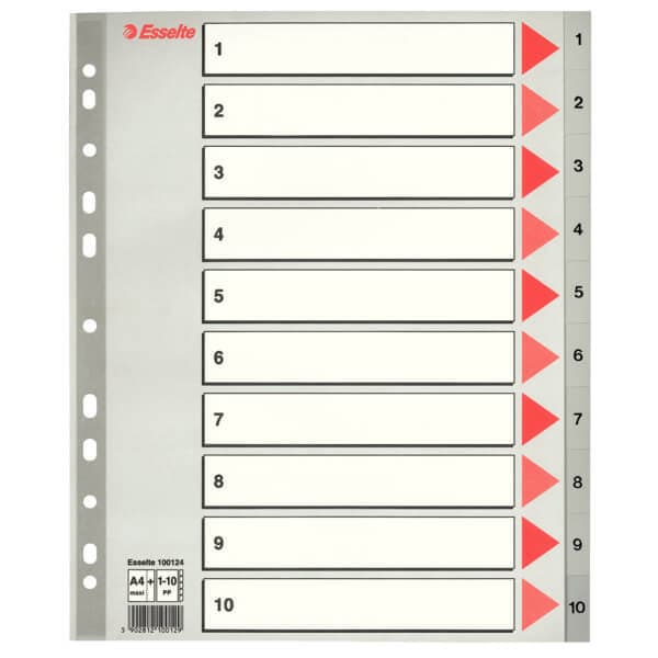 PP-register i grått med ti numeriske faner. Frontdeksel med store skriveområder for innhold og forsterket hullstripe. A4+ format gir rask tilgang, selv når du arkiverer med lommer. Universelt register med elleve hull.
