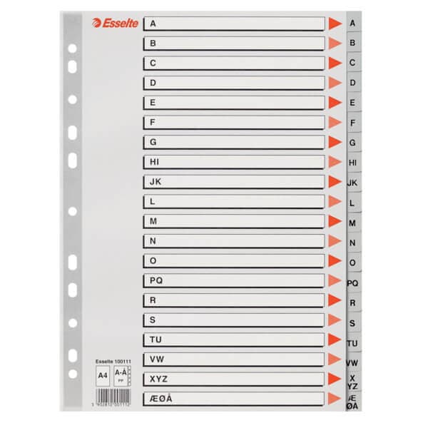 PP-register i grå farge med bokstaverte faner. Forsidearket har god plass til beskrivelse av innholdet og en forsterket hullkant. Universalregister med elleve hull.