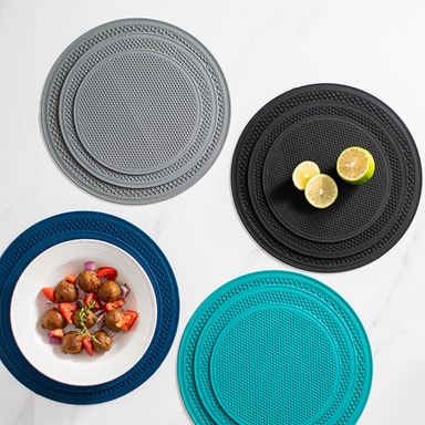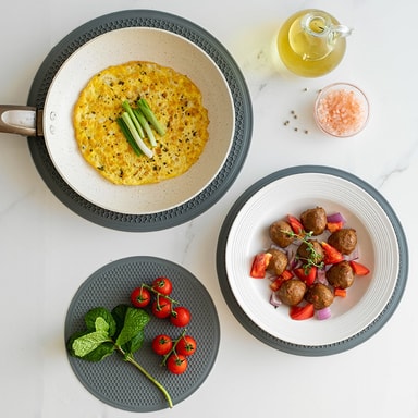 Anti-skli og stabil: Den teksturerte overflaten på matten gir et sikkert grep og forhindrer at platen glir eller glir under bruk. Den sklisikre designen sikrer stabilitet og trygghet når du håndterer varme kokekar.