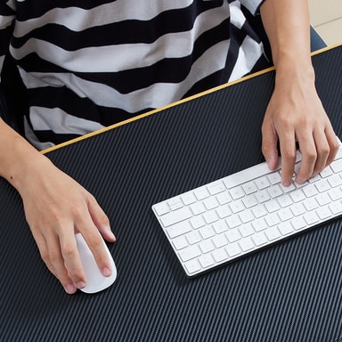 To materialer: Opplev den perfekte blandingen av stil og komfort. Denne skrivebordsputen har en stilig, karbonfiberteksturert PVC-overflate for enkel glidning og en naturlig korkbase for ekstra demping og stabilitet.