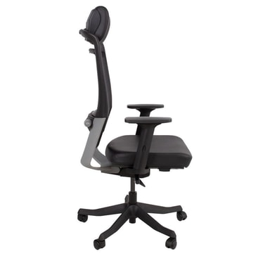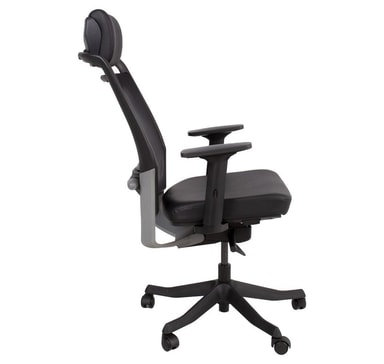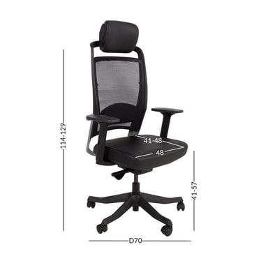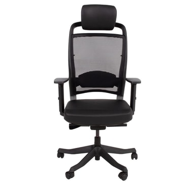 Arbeidsstol FULKRUM svart. FULKRUM er bygget for å vare og lar deg holde deg fokusert og effektiv gjennom hele arbeidsdagen. Den elastiske mesh-ryggen er behagelig og gir forbedret ventilasjon. Den justerbare korsryggstøtten gir nødvendig støtte for korsryggen. Høyden på hodestøtten er justerbar med 5 cm. Ryggrammen og armlenene er laget av sort plast. Den nedre delen av rammen og de vinklede delene av armlenene er forsterket med fiber. Stolens polstrede sete og nakkestøtte er dekket med svart skinn. Setedybden er justerbar. Den vektsensitive synkrone mekanismen justerer selv lenekraften til brukerens vekt og tilbyr flerposisjons tiltlås og pneumatisk setehøydekontroll. Høyden, dybden og rotasjonsvinkelen til armlenene er justerbare. Stolens 5-tappede fotstøtte er støpt av svart fiberforsterket nylon. Stolen har plasthjul, 50mm. De totale målene på stolen er 70x70xH114-129cm, setehøyde 41-51cm, setedybde 41-48cm og setebredde 48cm. Vektgrense 120 kg.