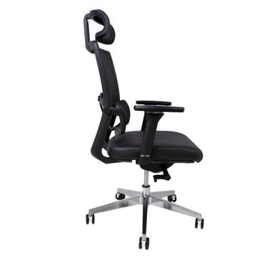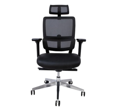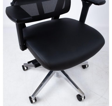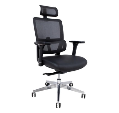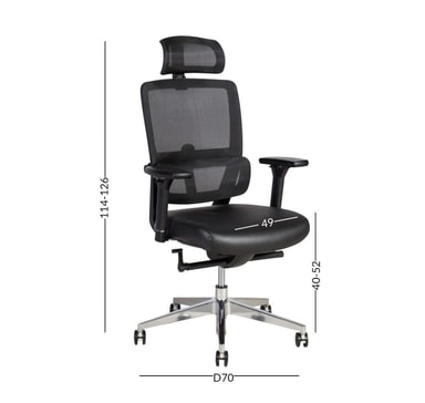 Arbeidsstol INTEGRA svart. Setet er dekket med skinn. Ryggstøtten er dekket med sort nettingstoff. Stolen har synkron mekanisme, korsryggstøtte. Pneumatisk setehøydejustering. Plastarmlenene har et mykt PU-deksel. Høyden og rotasjonsvinkelen til armlenene er justerbare. Basen er laget av polert aluminium. Stolen har gummihjul D60mm, stift: 11mm. Høyde 108-117cm, setehøyde 43-52cm. Dimensjonene på produktet er 65,5x61xH108-117cm. Vektgrensen er 120 kg.
