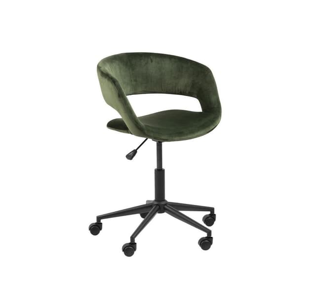 Skrivebordsstol GRACE skogsgrønn. Sete og rygg er dekket med skogsgrønt fløyelsstoff. Benet er svart og hjulene er myke. Pneumatisk setehøydejustering. Dimensjonene på produktet er 56x54xH87cm.