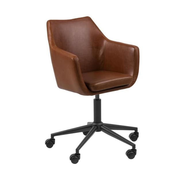 Skrivebordsstol NORA konjakk. Sete og rygg er dekket med konjakk imitert skinn. Benet er laget av sort metall. Stolen har plasthjul. Dimensjonene på produktet er 8x58xH91cm.