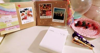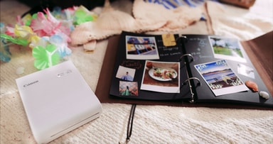 Det kvadratiske fotopapiret Canon XS-20L (selges separat) har selvklebende bakside og et klassisk utseende med hvit kant for håndskrevet bildetekst som gir et retro og nostalgisk uttrykk. Et beskyttende belegg sørger for at fotoutskriftene er smuss-, vann- og rivebestandige.