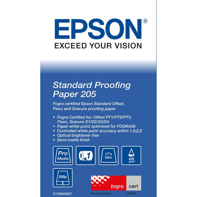 Epson 17"" Standard Proofing Papir ble utviklet for å oppfylle kravene som stilles til prøvetrykkmarkedet, som i stadig større grad innstiller seg på bruk av skrivere fra Epson med egnede medier. Dette mediet er spesielt godt egnet til prøvetrykk, og har en fremragende korttidsstabilitet når det brukes sammen med Epson UltraChrome K3-blekk med Vivid Magenta.