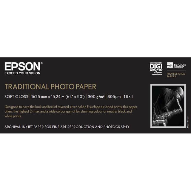 Epson Traditional Photo Paper er et gjennombrudd innen papirproduksjon. Den er utviklet spesielt for Epsons UltraChrome K3-blekk, og i samarbeid med mange ledende profesjonelle fotografer i bransjen for å sikre at den oppfyller deres høye standarder. Og som muliggjorde god kreativ kontroll takket være uvanlig høy D-Max og skyggegjengivelse i svart og hvit.