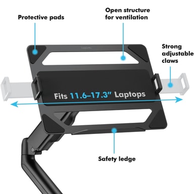 Den VESA-kompatibla hållaren för bärbar dator kan monteras på en monitorarm för att höja den bärbara datorn till ögonhöjd. Förbättrar hållningen, minskar belastningen på nacke och ögon, samtidigt som arbetsytan hålls organiserad.
