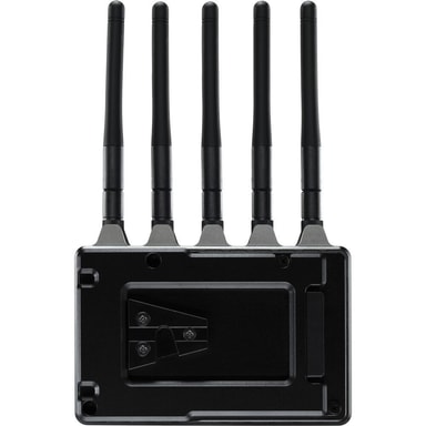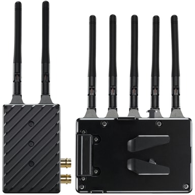 Teradek Bolt 4K LT 750 3G-SDI / HDMI Wireless RX / TX Deluxe Kit. Settet inneholder en trå dlø s sender og mottaker som kan motta trå dlø st opptil 1080p60 video med 10-biters 4:2:2 HDR-stø tte. Senderen innganger opptil 4K video over HDMI eller opptil 1080p60 video via 3G-SDI, og mottakeren sender ut video via HDMI og 3G-SDI. En V-mount batteriplate er inkludert for å drive mottakeren med et profesjonelt V-mount batteri.