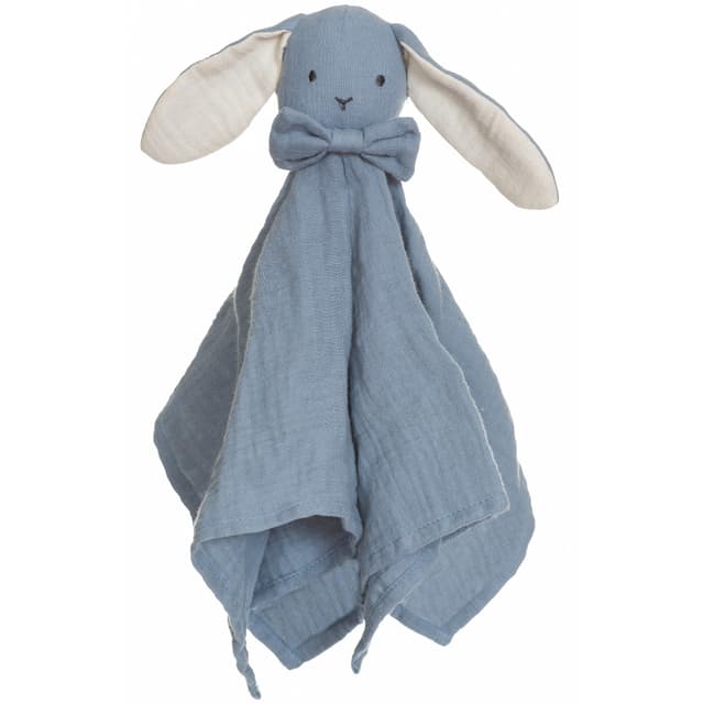Mykt og kosete blått musselinteppe med vår herlige Diinglisar-kanin som gir komfort og trygghet og raskt blir ditt barns beste venn. Perfekt størrelse for ethvert eventyr, og den blir bare mykere for hver vask. Laget av 100% bomull Oeko-tex.