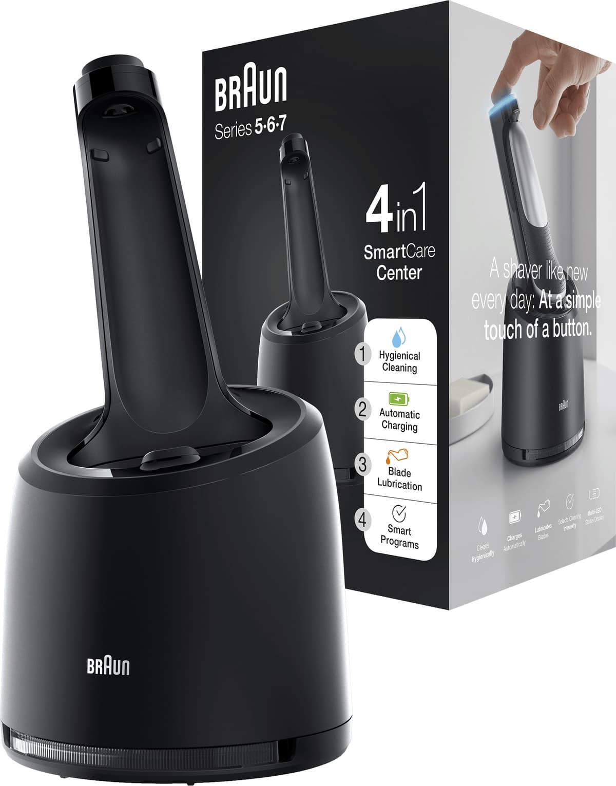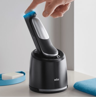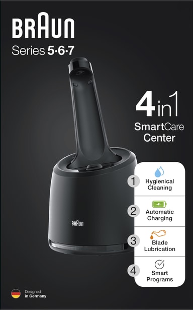 Med Braun 4in1 SmartCare rengjøringsstasjon, kan du hygienisk rengjøre din Braun Series 5, 6 eller 7 elektrisk barbermaskin ved å kun trykke på en knapp. Rengjøringsstasjonen fjerner opptil 99,9 % av bakterier, og lader barbermaskinen automatisk.Les mer om produktet