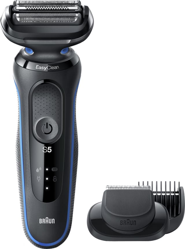 Med barbermaskinen Braun Series 5 kan du barbere eller trimme ansiktshåret med skånsom presisjon. Den er egnet til både våt og tørr bruk. Trimmetilbehøret lar deg velge selv hvor langt du ønsker at skjegget skal være. EasyClean-systemet gjør renholdet enkelt, du trenger ikke engang fjerne hodet.
