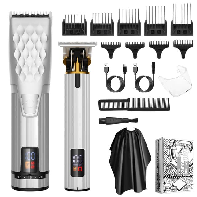 Massevis av tilbehør: Settet inneholder en rekke ekstra utstyr ut over denprofesjonelle hårklipperen og krøll-trimmeren, som store og små avstandskammer, USB-ladekabel, hårkam, rensebørste, beskyttelsesdeksel og frisørkappe.