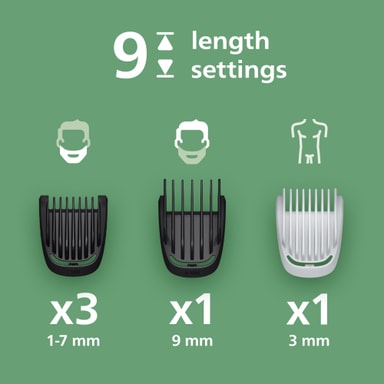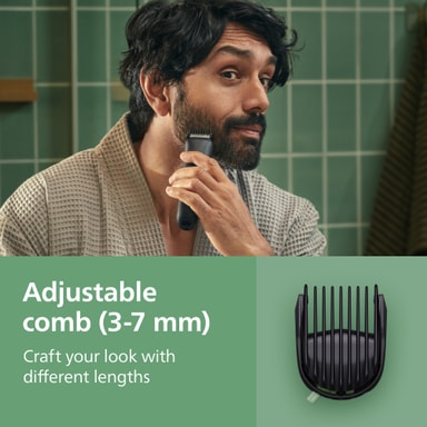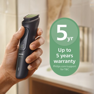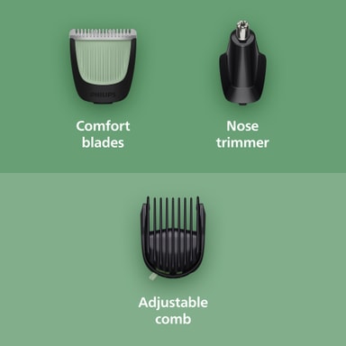 Philips All-in-One Series 3000 multitrimmer MG3935/15 er en 7-i-1-trimmer for skjegg-, kropps-, hår- og nesepleie. Den har selvslipende kniver, avrundede spisser, 70 minutters trådløs bruk og rengjøringsvennlige tilbehør for effektiv pleie.Les mer om produktet