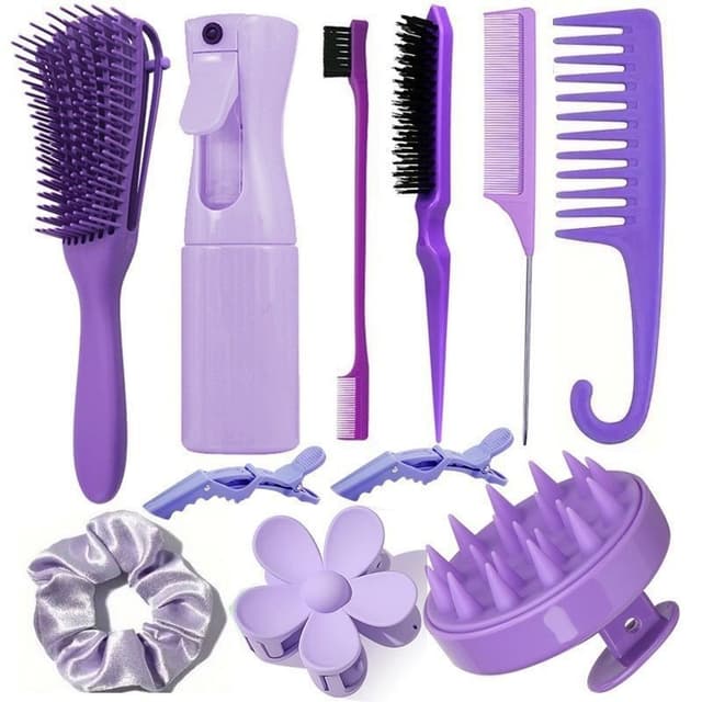 Komplett styling sett: Dette 11-dels hårstyling settet gir deg alt du trenger for å lage en rekke frisyrer. Settet inneholder fem forskjellige kammer, en sprayflaske for å fukte håret, to hårklemmer for seksjonering, en hårstrikk for hestehaler og knuter, en hårnål for å sikre intrikate frisyrer og en hodebunnsmassasjekam for avslapning. Enten du ønsker å lage elegante, rette frisyrer, spenstige krøller eller intrikate oppsett, har dette settet deg dekket. Materialene av høy kvalitet sikrer langvarig ytelse, mens den kompakte designen gjør det enkelt å oppbevare og reise med. Perfekt for både profesjonelle stylister og hjemmebrukere, dette settet er et must for alle som elsker å eksperimentere med håret sitt.