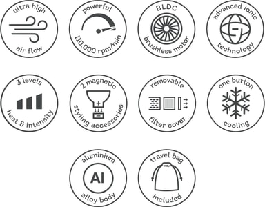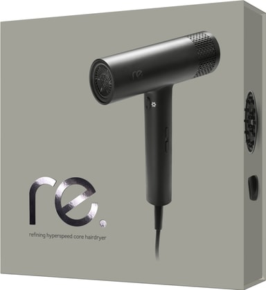 re. Hyperspeed Core hårføner er utstyrt med en 1800 W BLDC-motor og et avtakbart filterdeksel. Den har 3 varmenivåer (60-90-120z) og 3 hastigheter, i tillegg til en ionisk funksjon og en cool shot-funksjon for å redusere skader og etterlate håret glatt.Les mer om produktet