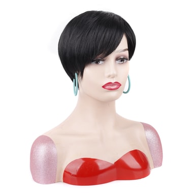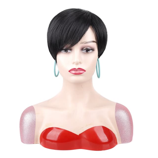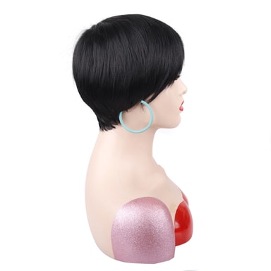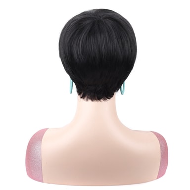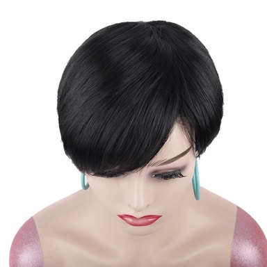 Umiddelbar stilfornyelse: Forvandle utseendet ditt umiddelbart med denne stilige svarte syntetiske parykken for kvinner. Sidepanneluggen gir et snev av eleganse og raffinement, perfekt for enhver anledning. Denne parykken gir en rask og enkel måte å eksperimentere med en ny frisyre uten å måtte klippe eller farge ditt eget hår. Nyt et friskt, moderne utseende på sekunder, og øk selvtilliten og forbedre ditt generelle utseende. Den korte, rette stilen er allsidig og utfyller en rekke ansiktsformer og antrekk, noe som gjør den til et must-have tilbehør for enhver motebevisst kvinne. Denne syntetiske parykken er designet for enkelt vedlikehold og langvarig bruk, og sikrer at du alltid ser best ut.