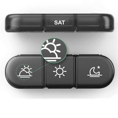 Denne doseringsboksen er ikke bare en beholder, den er en del av helserutinen din. Med en individuell pilleboks for hver dag i uken og distinkte ikoner for morgen, dag og kveld, har du full kontroll over medisinene dine. Den elegante sorte designen og kvalitets PP-materialet gjør den både holdbar og visuelt tiltalende. Å administrere dine daglige medisiner har aldri vært enklere eller mer stilig.