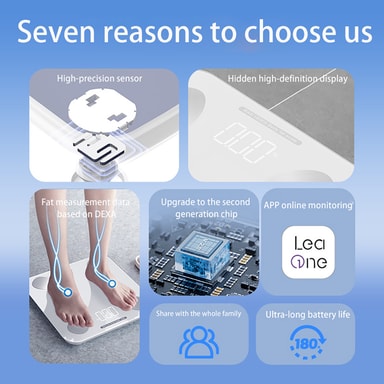 Avansert måleteknologi: Ved hjelp av bioelektrisk impedansanalyse (BIA) med dobbel frekvens sikrer den svært nøyaktige og pålitelige målinger. Denne avanserte teknologien trenger dypere inn i kroppen og gir mer presise målinger sammenlignet med tradisjonelle vekter. Opplev forskjellen i nøyaktighet og få en bedre forståelse av kroppens sammensetning.